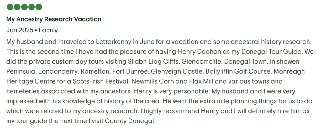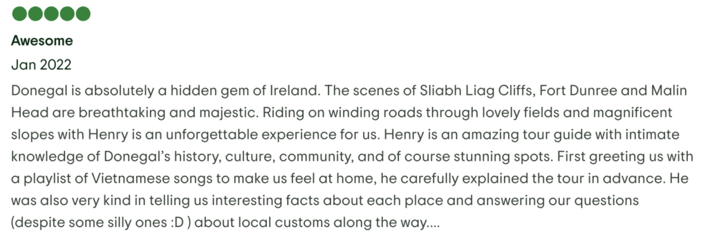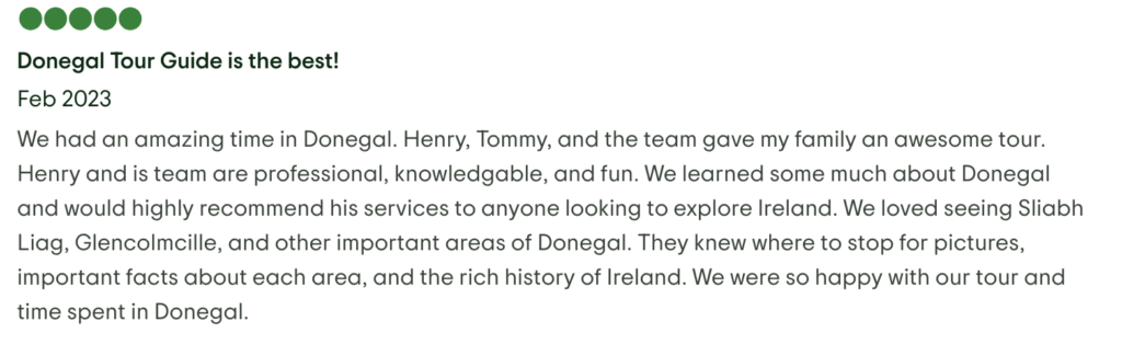 I typically recommend allowing up to 45 minutes to take a short walk, take photos and enjoy an ice-cream or alcohol-free beer at ‘The Sober Bar’. On my private tours of Donegal, I can allow for more or less time to suit individuals.